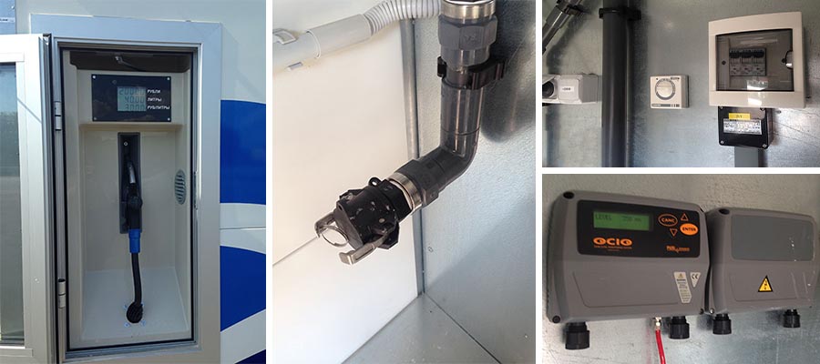 Сама заправочная станция AdBlue является емкостью для хранения жидкости AdBlue и раздаточной колонкой, которая снабжена системой учета и раздачи. Эта система интегрирована в клиентский комплекс учета и ей так же необходимо пройти сертификацию оборудования для коммерческой эксплуатации. В базовом комплекте AdBlue находится: техническая дверь с замком, утепленный контейнер, заправочная панель ADASTV-LINE8664, емкость для жидкости, насос, уровнемер, напорная линия, шланг и тд.